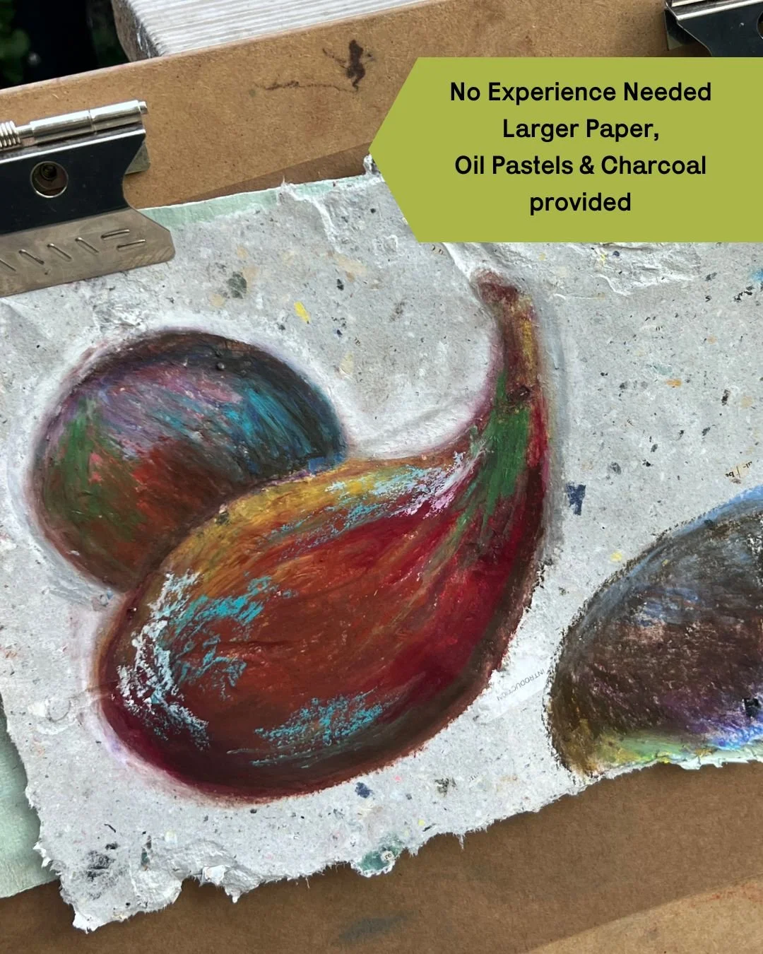 Our new drawing series in the garden! Draw our produce with oil pastels and charcoal on larger paper. We also have multiple color of our handmade paper available to use! Made during our Papermaking workshops every other month